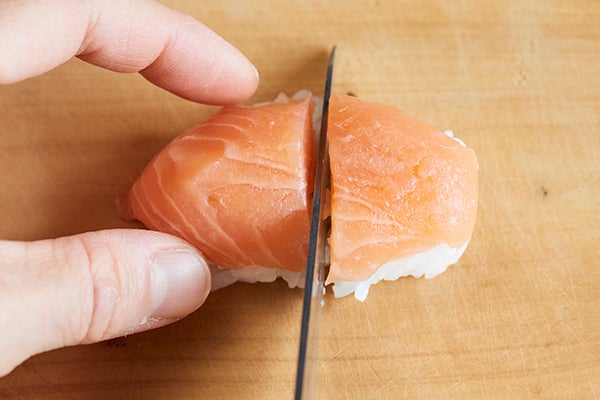 4、寿司を半分に切って、ラップの上に裏返しに乗せる。