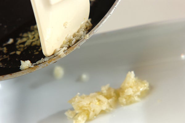 1、フライパンにオリーブ油とニンニクを入れ、弱火にかけ香りがたったら、いったんニンニクを取り出す。