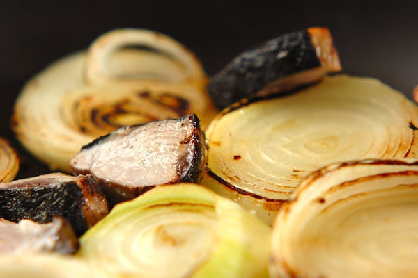 2、残った油で、カツオと玉ネギを両面焼き、塩コショウを振る。(ヒント)カツオはお好みの焼き加減で焼いて下さい。