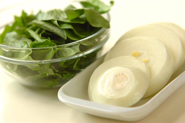 3、器に玉ネギを盛り、その上にカツオをのせる。(1)を散らしてバルサミコ酢をかけ、ルッコラを飾る。