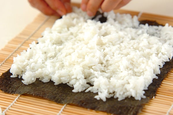 2、巻きすに焼きのりをのせ、炊きたてご飯を焼きのりの向こう側2cm位を残して全体に広げる。