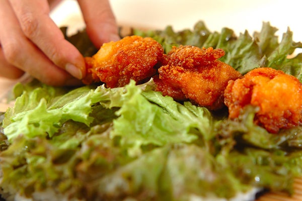 3、サニーレタスをおき、鶏の唐揚げを横一列にのせて<しばマヨ>をかけ、巻きすごと持ち上げて巻く。巻き終わりを下にして巻きすの上から両手で押さえ、形を整える。食べやすい大きさに切り、器に甘酢ショウガと盛り合わせる。