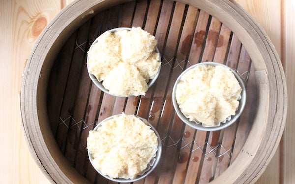 ベーキングパウダーは水分と合わさると、すぐに膨らむ力が働いてしまいます。粉類と液体を混ぜたら、型に入れてすぐに蒸しましょう。蒸し器がない場合は、フライパンで水を沸かし、沸騰したら生地を入れた型を入れてフタをすれば、同じように作れますよ。