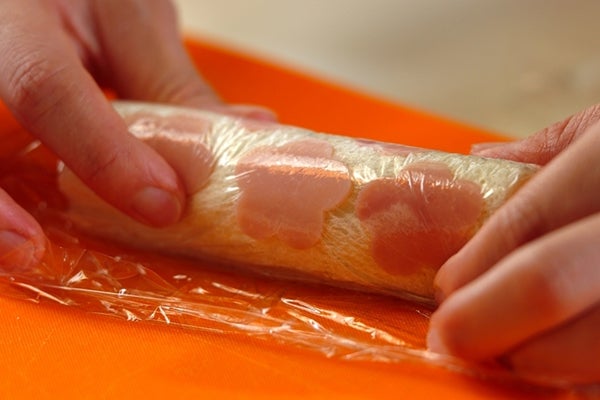 1、ラップをしいてハムを並べ、その上に食パンをおく。<ポテトサラダ>をぬり広げ、ラップごと巻いて両端をねじって止める(4本作る)。
