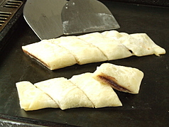 クレープのような生地にあんこを巻いて鉄板で焼くんです♡