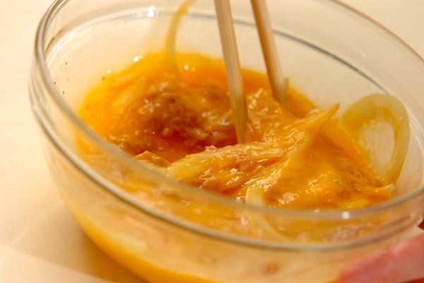 1、ボウルに卵を溶き、ツナ、玉ネギを加えて塩コショウを振り、よく混ぜる。