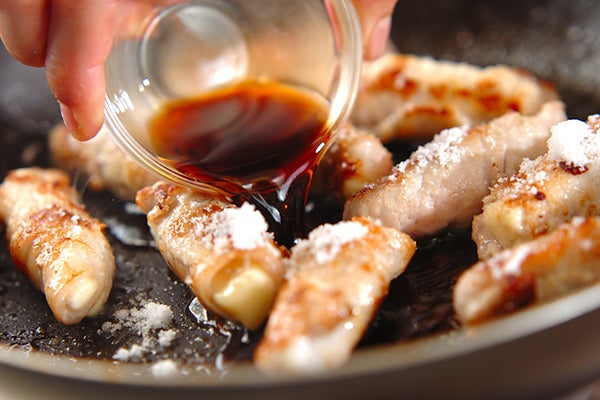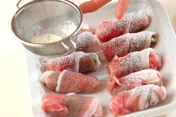 仕上がりをきれいにするには、焼いている間に豚肉が崩れないよう、巻き始めだけではなく巻き終わりにも小麦粉をふるうのがコツ。