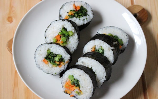 キムパの具は、人参と青菜、それぞれのナムル。のり巻きは材料の用意が大変なイメージですが、「たっぷり野菜のキムパ」なら野菜のナムルだけを用意すればいいので、下ごしらえも簡単。野菜が苦手なお子さんも、ごま油の風味が香り高く、無理なく食べられます。