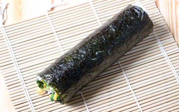 4、巻きすにのりを置き、3を広げて1と2を手前から1/3のところに置き、くるりと巻いてしばらく置いておく。
