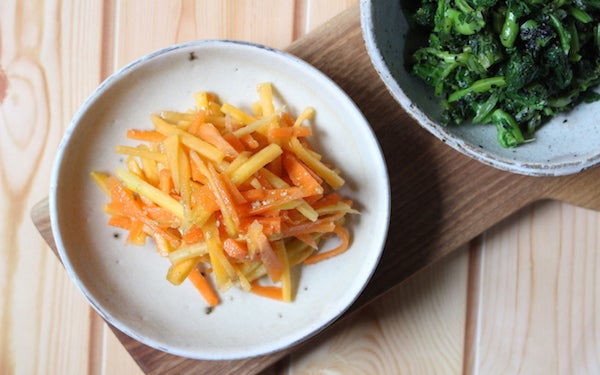 1、人参を千切りにしてボウルに入れ、塩を加えてしばらくおく。しんなりしたらごま油と白すりゴマを加えて和える。