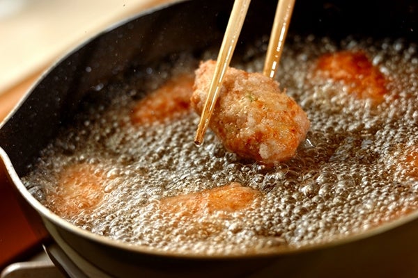 2、揚げ油を170℃に熱しておく。手に分量外の油をつけて(1)を小さめの小判型に形を整える。片栗粉を薄くつける。