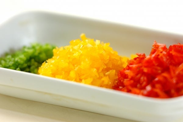 赤パプリカ、黄パプリカ、ピーマンはヘタと種を取り、細かめのみじん切りにする。