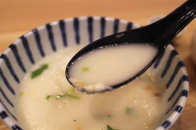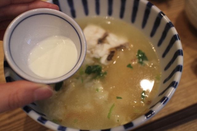 コンソメベースのお出汁をかけていただきます。トリュフオイルが決め手となっており、ふんわりと贅沢な香りが立ち込めます。