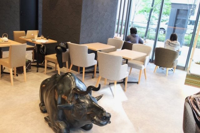 お店に入ってまず目につくのが、どっしりと座っている黒い牛!こちらは、北野天満宮にある「撫で牛」と呼ばれている有名な牛の像で、牛を撫でるとご利益があるとされているそうです。東京で撫で牛に会えるなんて縁起がいいですね。ついつい写真を撮りたくなってしまいます!