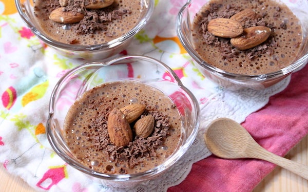 「甘酒豆乳プリン」の作り方1でココアを加えてから加熱すれば、チョコ風味のプリンのできあがり! ナッツや刻んだ板チョコをのせれば、濃厚な風味のプリンが味わえて、お子さんも満足することと思います。