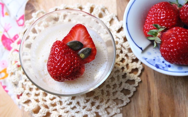「甘酒豆乳プリン」の甘みに使うのは、米こうじの甘酒。酒かすとお砂糖を使った甘酒と違い、お米と米こうじだけで発酵されているので、小さいお子さんにも安心して使える甘味料です。甘酒には酵素も含まれているので、腸から元気になりますよ。
