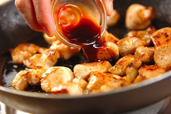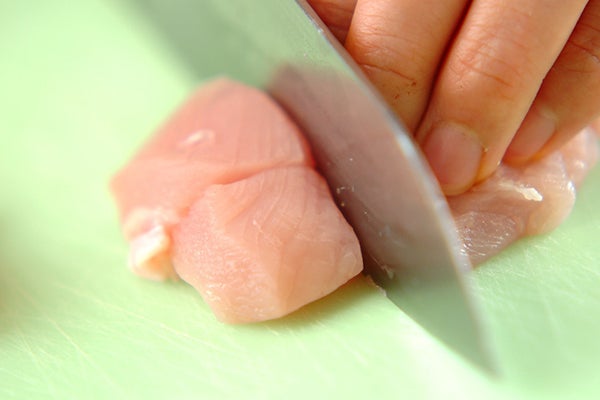 ・鶏むね肉は2cm角に切り、<下味>の材料をからめる。