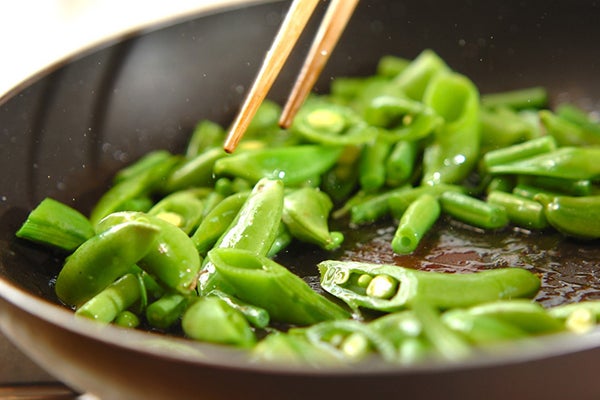 1、フライパンにゴマ油小さじ1を熱し、スナップエンドウとサヤインゲンを1~2分炒め、いったん取り出す。