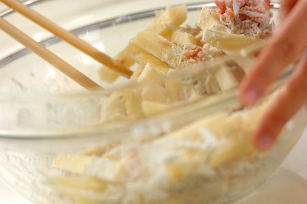 1、ボウルに水気をきったジャガイモ、チリメンジャコ、ツナをサックリ混ぜ合わせ、<衣>の小麦粉、片栗粉を加え全体にからめる。