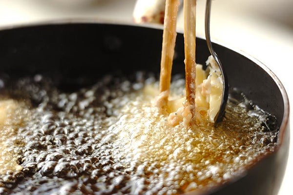 2、卵液を加えながら、衣の堅さを調節し、全体にまとまるくらいになったら、スプーンでひとくち大にして揚げ油に落とし入れ、サックリ揚げる。