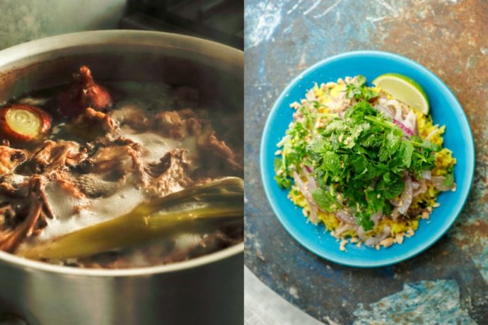 現地ではご飯の上に焼いたチキンをのせるのですが、そこはフレンチ出身の白井さんの腕の見せどころ。鶏の骨を10時間コトコト煮込んだフォー用のスープで炊いたターメリックライス。その上にのせるのは鴨肉のコンフィ。そこに紫玉ねぎとたっぷりのハーブを盛れば、オリジナルのコムガーの完成です。