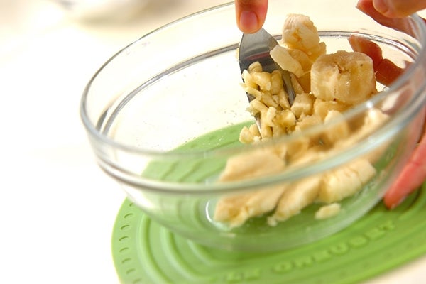 2、ボウルにバナナを手でちぎって入れ、フォークでつぶしピューレ状にする。(1)を加えよく混ぜ合わせる。
