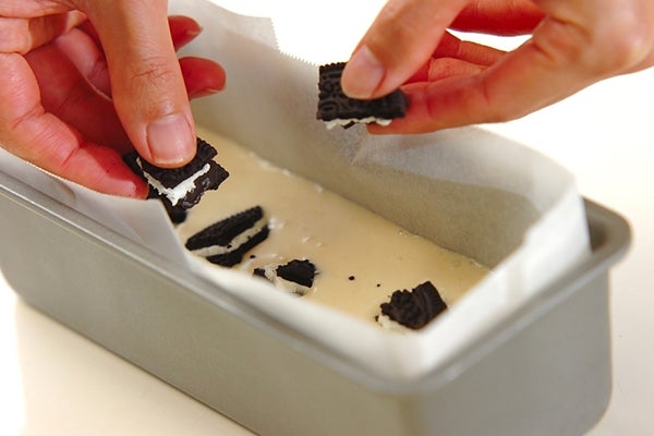 4、オーブンシートを敷いた型に(3)を流し入れ、ココアクッキーを手でひとくち大に割り上に散らす。170℃に予熱しておいたオーブンで25~35分焼く。