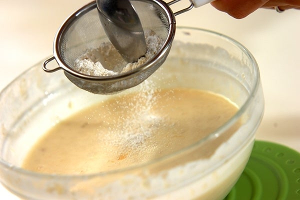 3、砂糖、レモン汁、生クリームを順に加え混ぜ合わせる。卵を割り入れ、よく混ぜたら薄力粉を振るい入れ混ぜ合わせる。
