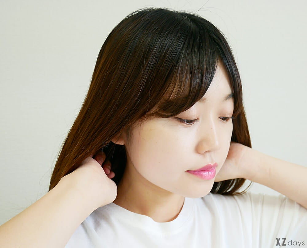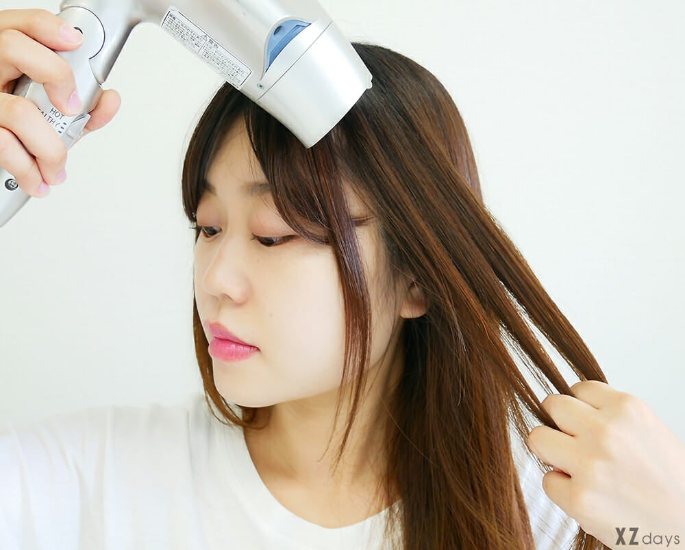乾かす手順は、前髪→根元→毛先の順に。根元を乾かした後、髪を軽く引っ張りながら毛先まで乾かし、毛流れを矯正します。