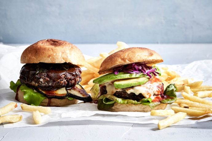 テリヤキバーガーは、玄米にマッシュルームや玉ねぎを合わせた旨味たっぷりの特製パテを、レタス、ナス、ソイマヨネーズと一緒にサンド。甘辛いテリヤキソースのとろみは、がごめ昆布の仕事です。ほんのりスパイシーなアボカドチーズバーガーは、特製パテに酒かすでつくったヴィーガンチーズを乗せて焼き上げました。ほのかな酒かすの香りと上品なコクが程よいアクセントに。