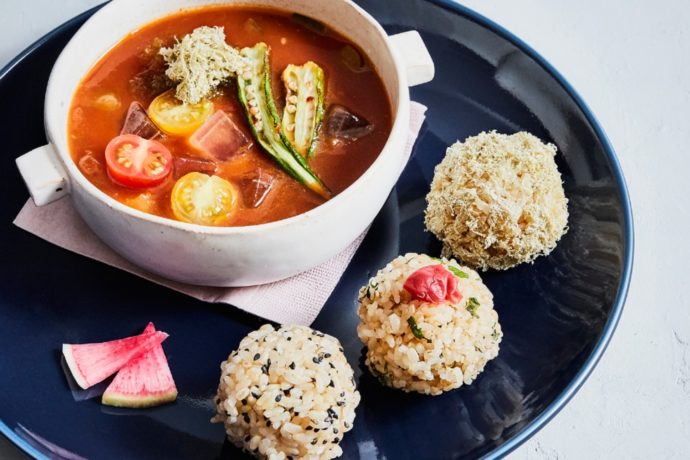 写真:ごろごろ野菜とアロエベラのトマトスープセット(ひとくち玄米おむすび3つ付き)¥1,000