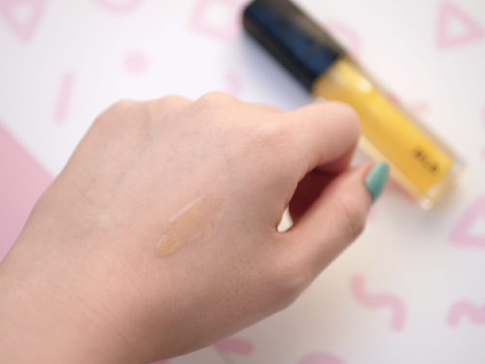 今回は、プチプラで優秀なアイテムが多いと評判の、LB「スパイシージュリーリップグロス」のジューシーイエローを使用していきます。テクスチャーはゆるめ、カラーは肌にのせたらわかる程度のほんのりイエローです。