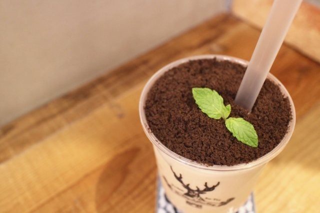 次にご紹介するのは、「盆栽」という名前がついたもの。作ってもらったドリンクを見て納得!土に見立てているのは砕いたサクサクのクッキー。そこにミントが添えられているのです。遊び心のあるネーミングですね。こちらは、ドリンクのクッキーの間に生クリームの層があるので、濃厚で少し甘め♪デザート感覚で飲めるドリンクです。