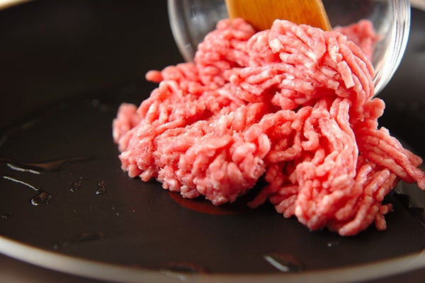 1、フライパンにサラダ油を熱して豚ひき肉を炒め、色が変わったらニンニクを加え、香りがたつまで炒める。