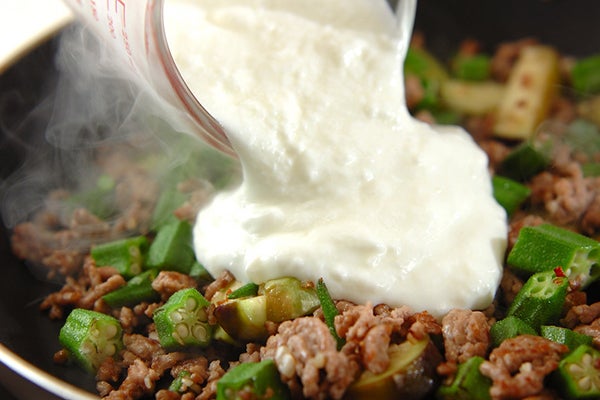2、オクラとナスを加えて2~3分炒め、さらにプレーンヨーグルトを加えて混ぜながら3~4分煮る。