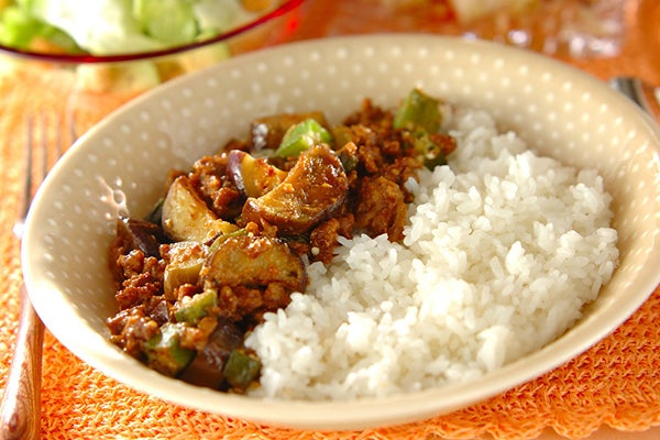 汁気の少ないドライカレーのようなこちらは、オクラの粘りがポイント。煮込んだオクラはトロッとして、お子さんでも食べやすいですよ。またひき肉を使うので、火が通りやすく時短が叶います。