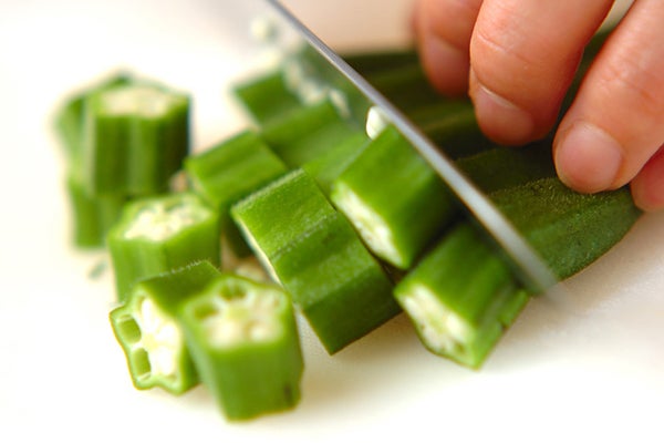 ・オクラはまな板に並べて分量外の塩を振り、手のひらで転がしながら繊毛を取るようにこする(板ずり)。サッと水洗いして水気を拭き、ヘタを切り落として幅1cmに切る。