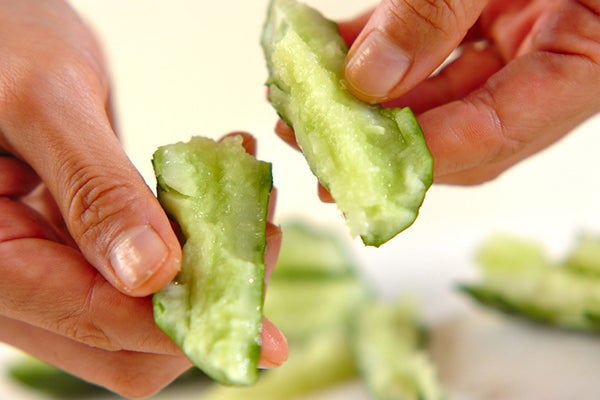 キュウリは両端を切り落とし、すりこ木でたたき割る。食べやすい大きさに分け、種を取る。