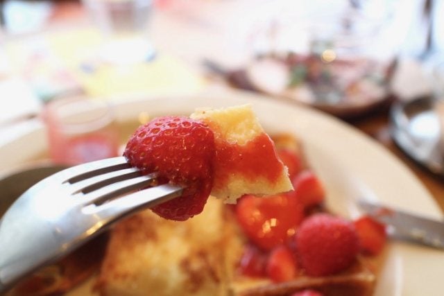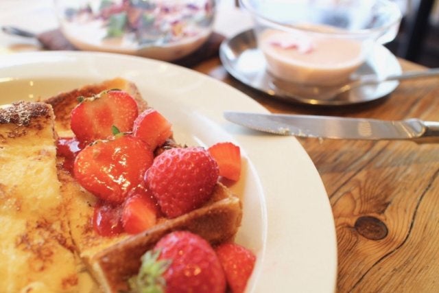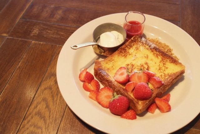 今回はいちごがたっぷりのったフレンチトーストをいただきました。華やかな見た目もあり、大人気のメニュー。新鮮ないちご、ストロベリーのソース、ホイップクリームをお好みでのせていきます。女子の大好きな組み合わせ!フレンチトーストの食感も軽く、食べ終わるまでまったく飽きませんでした♪