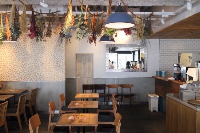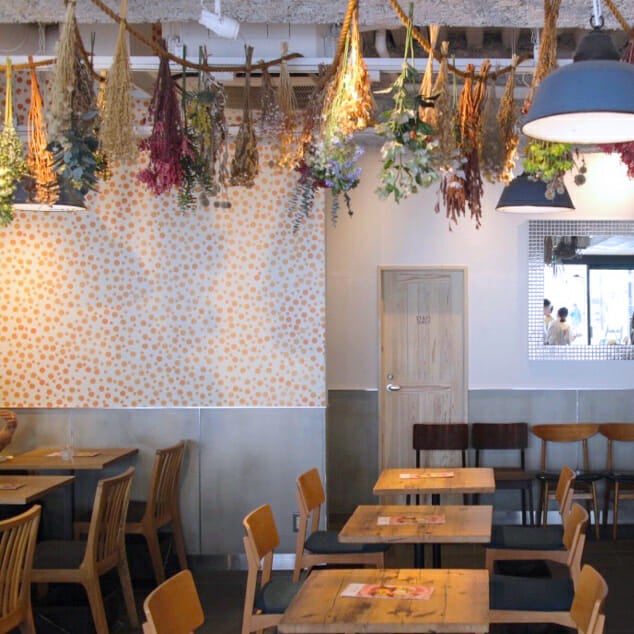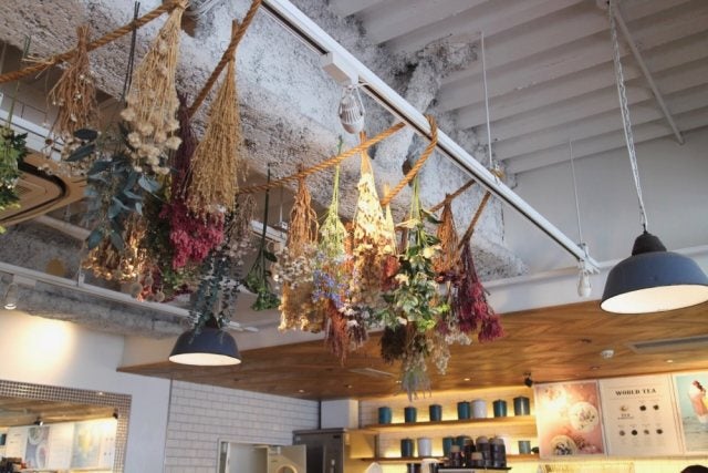 連なって飾られたスワッグは、カフェのメニューにも入っているお花やハーブをイメージしているかのよう。店内をぐるりと見渡しても忙しさを忘れられるようなホッとできるお店です。