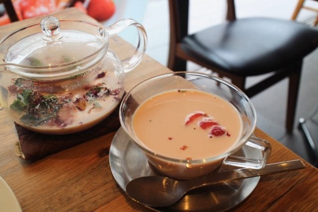 カフェに行くとついついカフェラテを頼んでしまう人、多いのではないでしょうか。そんな人にこそぜひ頼んでほしいこちらのミルクティー。カップに注ぎ終わった後のポットを見て驚くのがお花とハーブの量!とっても贅沢に入っているので、贅沢な風味がするんです。「Afternoon Tea Love&Table」ならではのメニューなので、まずはぜひこのドリンクを頼んでみてくださいね。
