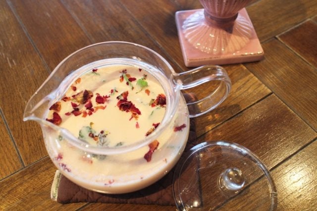 今回、取材に行く前からずっと気になっていたこちらのドリンク。インスタグラムでもよく見ていたのです!「フェアリーズティー」と名付けられたミルクティーには、華やかなお花とハーブがたくさん浮かんでいます♪