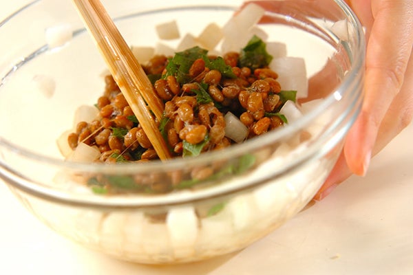 塩でもんだ大根とちぎった大葉に納豆を和えた一品です。大根の歯ごたえと風味豊かな大葉が、いつもの納豆を数倍おいしくしてくれます。そのまま食べるのはもちろん、ご飯や冷奴にのせて食べるのもおすすめですよ。