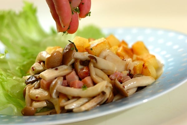 キノコと揚げジャガイモのホットサラダ