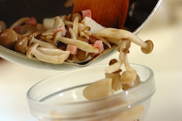 ・シメジとエリンギは、石付きを切り落とす。シメジは、小房に分ける。エリンギは、食べやすい大きさに切る。