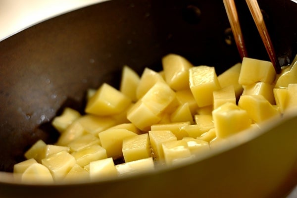 揚げは揚げでもここではフライパンを使った揚げ焼きのこと。あらかじめレンジで加熱したサイコロ状のジャガイモを使うので、揚げ時間もあっという間です。