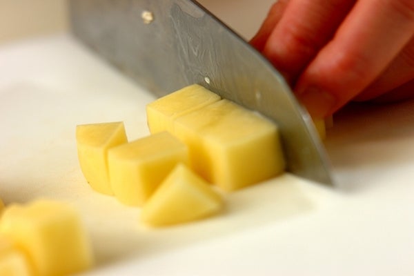 ・ジャガイモは皮をむき、1.5cm角のサイコロ状に切って耐熱容器に入れる。軽くラップをかけ、電子レンジで2分加熱する。