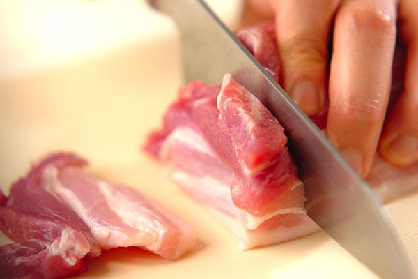 ・豚バラ肉は厚さ7~8mmの食べやすい大きさに切り、塩コショウ、ショウガ汁をからめておく。