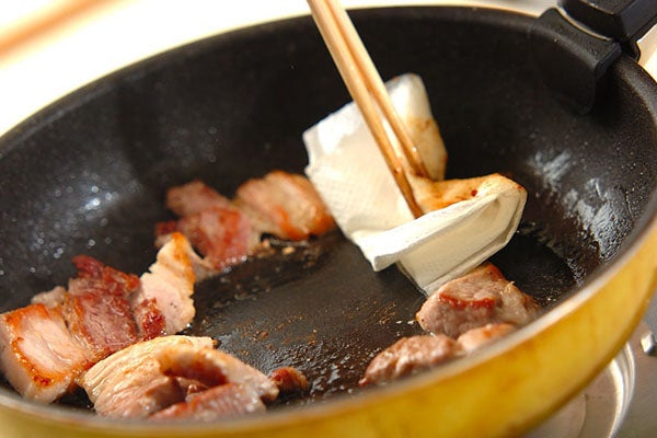3、豚バラ肉に火が通ったら油をキッチンペーパーで拭き取り、<合わせ調味料>を加えてからめながら炒める。