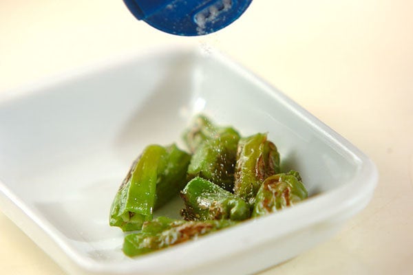 1、フライパンにサラダ油少々を中火で熱し、シシトウを炒める。色が鮮やかになったら取り出し、分量外の塩を振る。